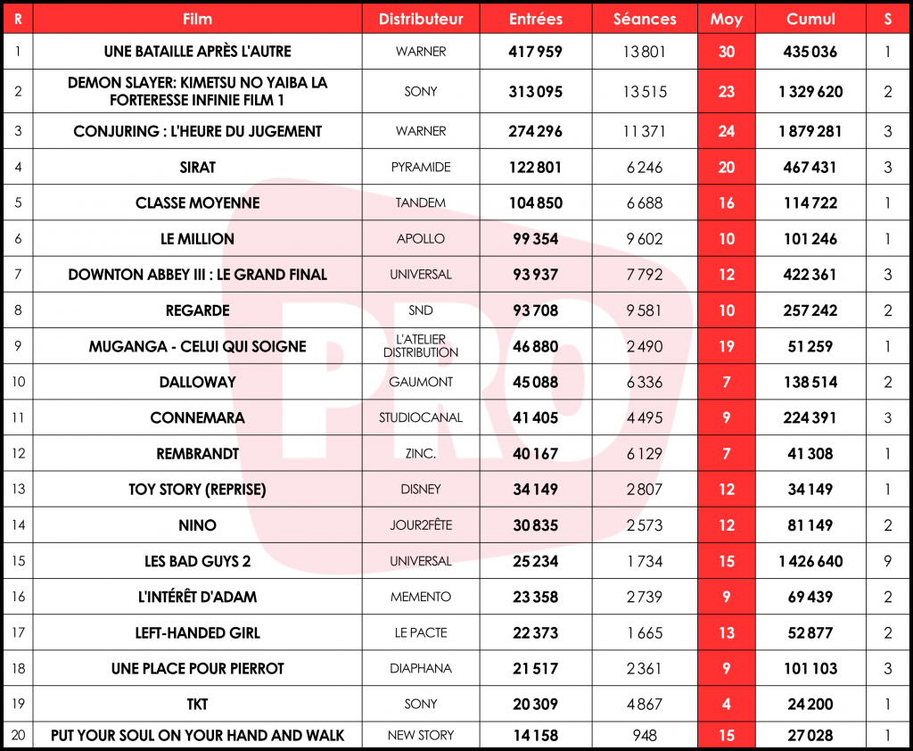 417 000 cinéphiles se sont déplacés dans les salles pour découvrir Une bataille après l’autre, soit une moyenne de 30 entrées par séance (e/s). Une solide semaine de démarrage pour le film porté par Leonardo DiCaprio, dans la lignée du lancement de sa précédente apparition, Killers of the Flower Moon (418 000 tickets, dont 37 par séance, en 2023). Parmi les autres blockbusters d’auteurs sortis ces dernières années, Une bataille reste en dessous des performances de Babylon (468 000 billets, 36 e/s) et Juré n°2 (453 000 entrées, 41 e/s) mais légèrement au dessus de Mickey 17 (413 000 spectateurs, 27 e/s).