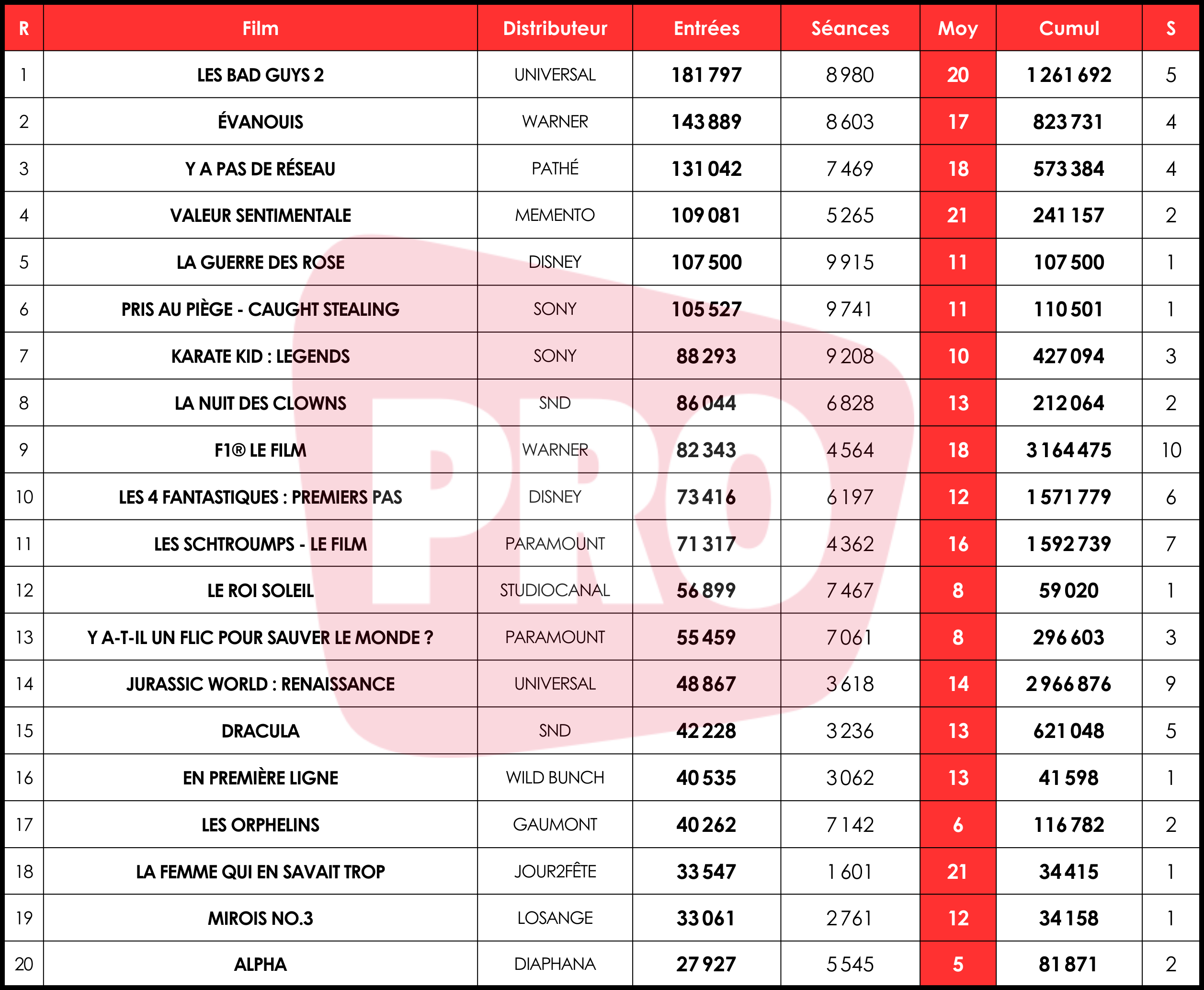 Les six nouveautés du classement n’insufflent malheureusement pas le dynamisme espéré, et cumulent 377 000 entrées sur 34 500 séances. Au coude-à-coude, La Guerre des Rose et Pris au piège écoulent tous deux 11 e/s, pour de timides démarrages au regard de leurs près de 10 000 séances respectives. La meilleure performance, parmi les sorties du top 20, vient de La Femme qui en savait trop, distribué par Jour2Fête, qui attire 33 000 spectateurs pour une solide moyenne de 21 e/s. Il s’agit d’un nouveau joli succès pour un récit iranien, après ceux de Lire Lolita à Téhéran (180 000 entrées), Tatami (185 000 entrées) ou encore Les Graines du figuier sauvage (620 000 entrées), et en attendant la sortie de la Palme d’or Un simple accident le 1er octobre.