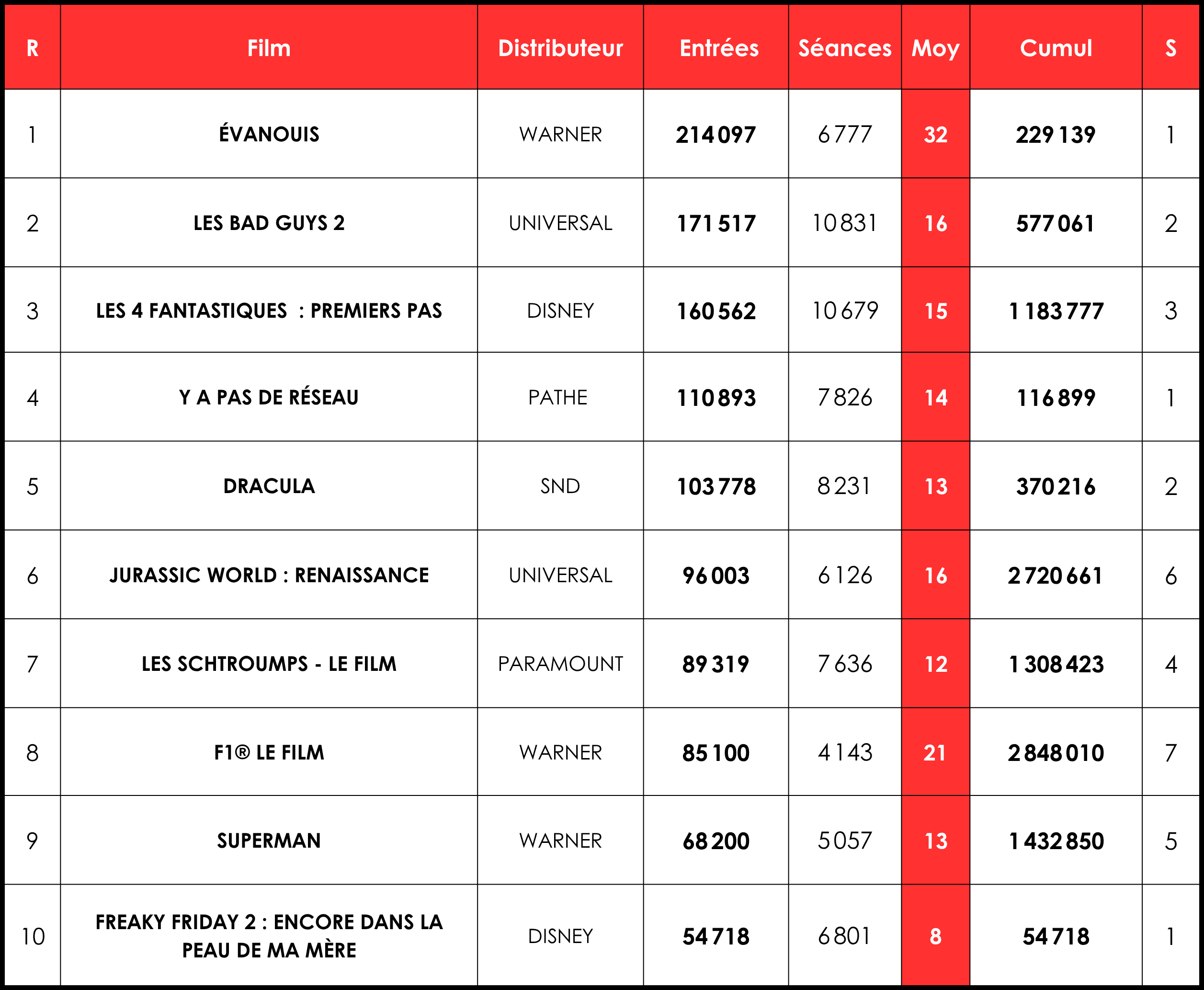À noter enfin que c’est un titre hors top 10, Jujutsu Kaisen : Trésor caché / Mort prématurée – Le Film, qui réalise plus haute moyenne par séance du week-end. L’anime a été diffusé par Sony Pictures sur près de 300 séances sur les uniques journées de samedi et de dimanche, attirant en moyenne 64 spectateurs. Le film obtient ainsi la 4e meilleure moyenne week-end de démarrage de l’année – entre les 67 du documentaire Personne n’y comprend rien et les 49 de F1 Le Film.