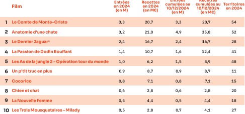 Les trois premiers mois de l’année ont été marqués par les continuations d’Anatomie d’une chute (3,2 millions d’entrées, 4,9 au cumul), de La Passion de Dodin Bouffant (1,4 M / 1,6 M) et des As de la jungle 2 (1,0 M / 1,5 M), et par l’arrivée du Dernier Jaguar (2,4 M). Et ce n’est qu’à la rentrée de septembre que démarre la carrière internationale du Comte de Monte-Cristo (3,3 M), le film français le plus vu sur grand écran à l’international de l’année écoulée.